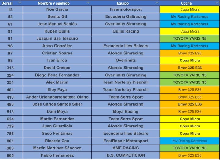 Lista de inscritos do 1° Rallymix Serra Argallo Figueiró Tomiño VIRTUAL